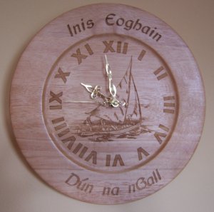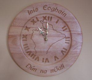 Clocks are available with or without "Inis Eoghain, Dún na nGall" around the edge (please specify).